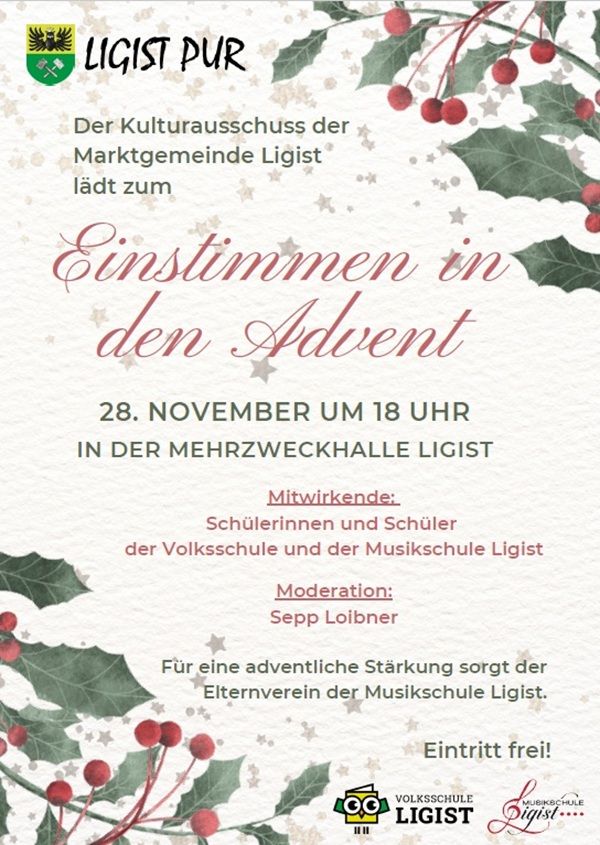 Der Kulturausschuss der Marktgemeinde Ligist lädt am Freitag, 28. November 2024, um 18:00 Uhr zum Einstimmen in den Advent in die Mehrzweckhalle Ligist ein.